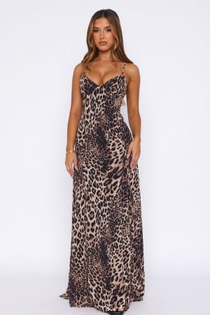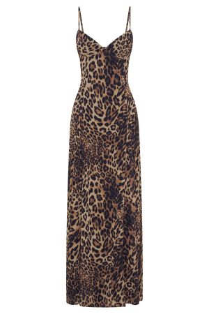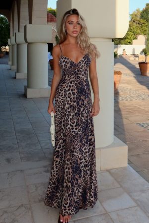 Make a lasting impression in the A Day In Nice Maxi Dress in Leopard. Features thin. adjustable straps and sculpted bust cups for a flattering shape. The fitted waist then flows into a full-length skirt that sways with your every step. Style it with kitten heels. a chic shoulder bag and gold jewellery for a look that radiates sophistication wherever you go.