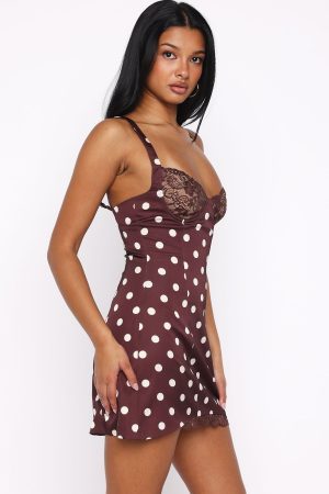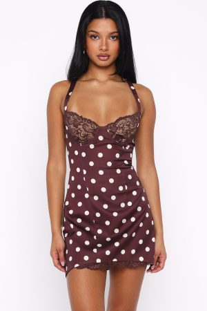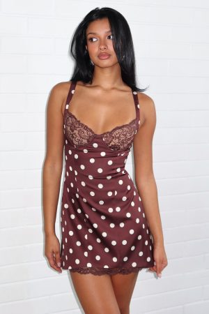 Be the center of attention in the Admire You Mini Dress in Choc/Cream Polka Dot. This sultry mini dress features thin. adjustable straps and a sweetheart neckline with bust underwire for added support. Delicate lace detailing graces the bust and hem. adding a touch of elegance. The invisible center-back zipper ensures a seamless fit. while the lined. silky fabrication offers comfort. Pair it with a cute mini bag and clear heels to complete your dreamy look.