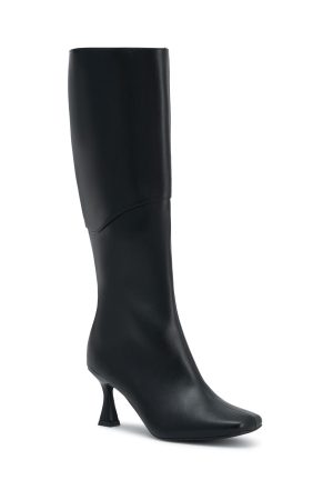 Classic and refined. the Adriel Knee High Boots in Black feature a sleek square closed toe and slender heel that elevate any outfit. Style them with denim jeans and a statement jacket for a polished. fashion-forward look.