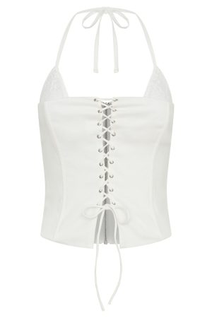 Channel IT girl vibes in the After Party Bustier White! Features a halter neck design. inner lace bralette detailing. front lace up closure. cropped length. boning in bodice and back zipper and clasp closure. We love this paired with the I’m No Angel Shorts!