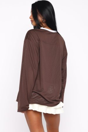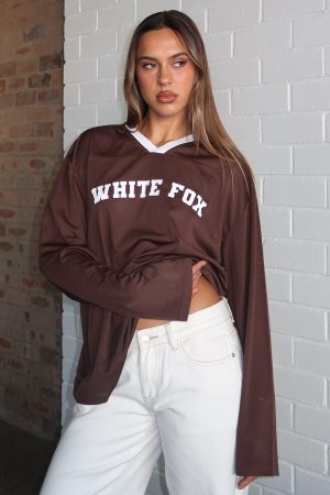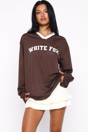 Bring a cool edge to your wardrobe with the Ahead Of Schedule Long Sleeve Oversized Jersey in Chocolate! Features a V‑neckline. slouched shoulders. long sleeves. an oversized silhouette. a centre‑front printed White Fox text. ribbed neckline detailing. and unlined stretch fabric for easy comfort. Style with your go to denim jeans. sunnies and sneakers for a casual but cool weekend fit.