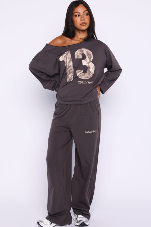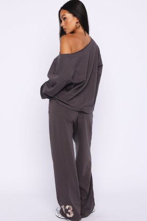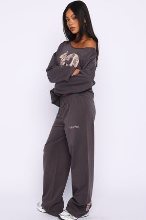 Get comfy with cool vibes in the All A Dream Track Pants in Charcoal. Designed with a thick elastic waistband and a relaxed wide‑leg silhouette. these pants feature White Fox text at the front and an unlined jersey interior for serious comfort. Style them effortlessly with the matching All A Dream Off Shoulder Oversized Long Sleeve Tee in Charcoal for a coordinated. laid‑back look you’ll want to live in.