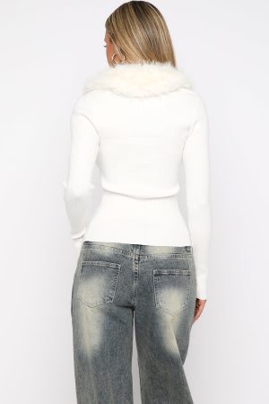 In Focus: Knitwear. The All Bundled Up Knit Cardigan in Snow White is crafted from unlined high‑stretch knit fabrication. featuring a V‑neckline with a detachable fur collar. full button‑front closure. long sleeves and a relaxed silhouette. Style denim jeans with sleek boots for a chic. city-night fit.