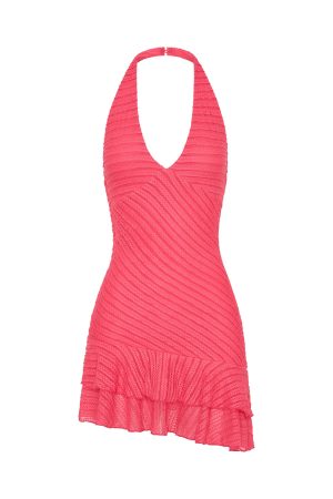 Say hello to your new summer go-to. The All I Wanted Was This Mini Dress Hot Pink features a halter neck design with back button and loop closure. plunge V neckline. lined. asymmetrical hemline. backless. invisible side zipper and clasp closure. mini length and frill detailing at hem. Style with a mini shoulder bag and flower hair clip for a fire fit’!