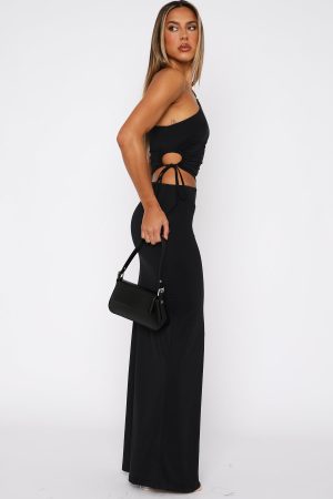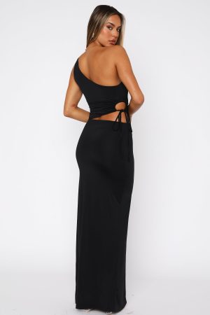 The All Inclusive Maxi Dress Black is perfect for all occasions. Features a one shoulder design with a single thick strap. cut out side design. adjustable side ruching with tie-up straps. maxi length. high cut side split hemline. stretch fabric. lined and a gorgeous fabric. Pair with kitten heels and high shine accessories for a super cute vacay fit’!
