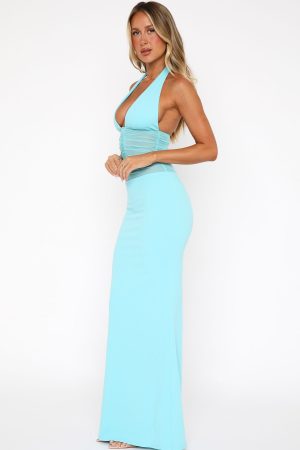 Create the dreamiest look in the All My Love Maxi Dress Aqua! Features a halter neck design with hook and loop closure. low plunge sweetheart neckline. sheer bodice with ruching detailing. maxi length. backless. back split detailing. and stretch material.