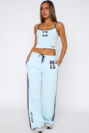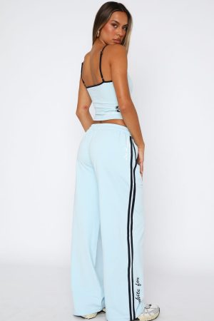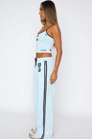 Athletic in shape. relaxed in style. The All Star Season Track Pants in Baby Blue features a thick waist and drawstring. printed logo front side. taping detail on the side. high rise fit and soft. unlined fabric. Pair with the matching All Star Season Singlet in Baby Blue for a chic and sporty look!