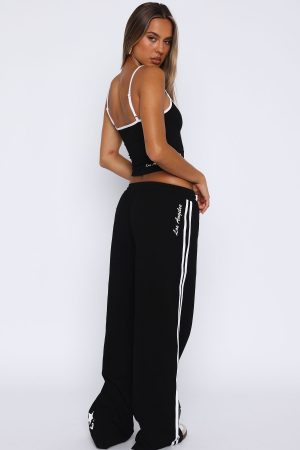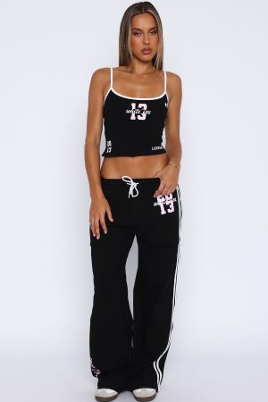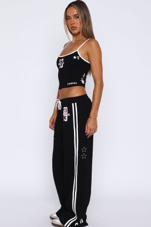 Athletic in shape. relaxed in style. The All Star Season Track Pants in Black features a thick waist and drawstring. printed logo front side. taping detail on the side. high rise fit and soft. unlined fabric. Pair with the matching All Star Season Singlet in Black for a chic and sporty look!