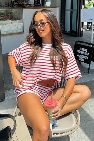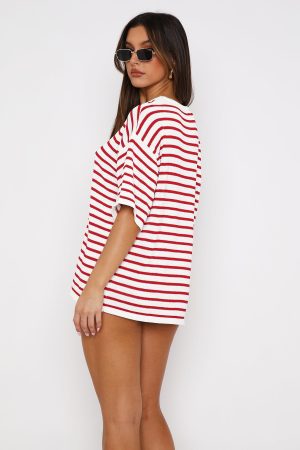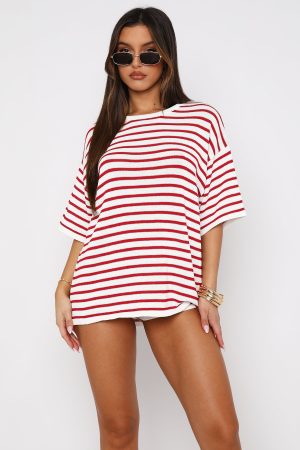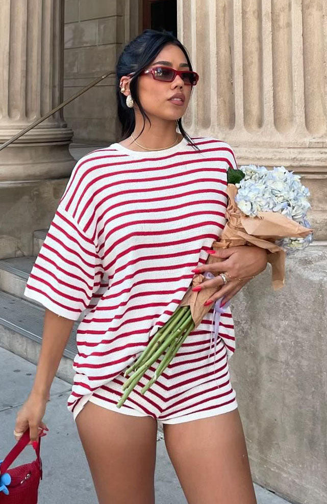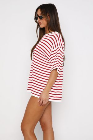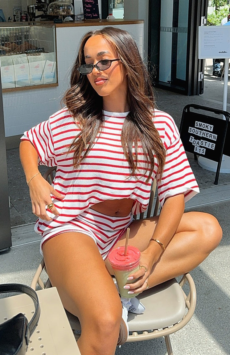The All The Little Things Top Red Stripe is a must for your new season lounge collection. Features an over-sized look. no lining. slightly sheer. stretch material for an easy slip on design and full length. Style with All The Little Things Shorts and your favourite pair of sneakers for a cozy vibe!