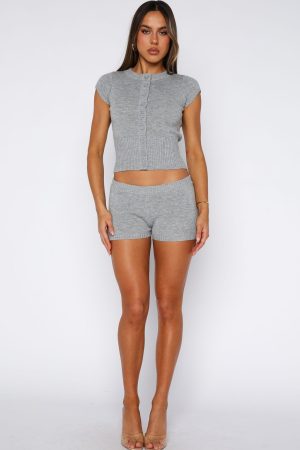 Don’t let this be the one that got away! Our Almost Love Knit Top in Grey features a round neckline. cap sleeves. button closure down front and thick ribbed knit waist. For ultimate comfort this top is designed with high stretch fabrication and unlined for a lightweight feel. Complete the look with the matching Almost Love Knit Shorts Grey.