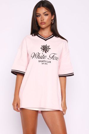 I’m nicer when I like my outfit. The Along The Way Oversized Jersey in Pink brings effortless cool to your wardrobe. Features a relaxed V-collar neckline and short sleeves with sporty stripe detailing at the cuffs. The centre front is embroidered with White Fox text paired with a rose graphic for a stylish statement. Designed with an oversized silhouette that’s perfect for laid-back days. and finished unlined. Style with a mini skort and your fav trainers for a sporty yet chic look!
