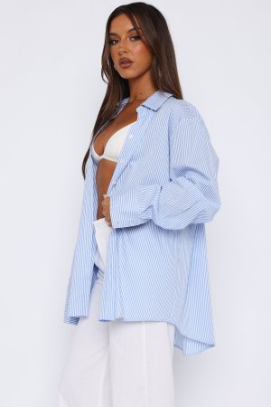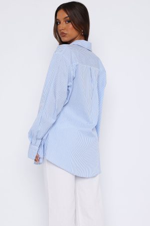 Featuring a light weight. striped fabric. collared neckline. button front and cuff closure and relaxed fit. We love this paired with the Always About Us Pants for a euro summer look!
