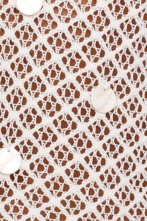 Beachwear that begs for an afterparty. The Amalfi Daydream Crochet Mini Dress White features a halter neck style with back closure. low scooped neckline. backless. unlined sheer material. mini length and high shine. faux shell embellishments.