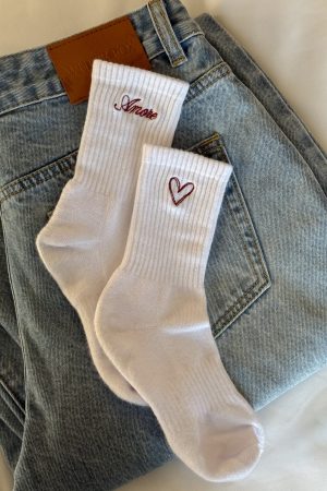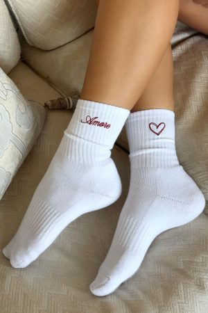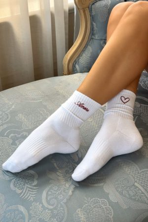 Add a touch of love to your fit with the Amore Mio Socks in White. Crafted from a soft fabrication. these ribbed ankle socks offer a cozy fit and feature an amore and love-heart graphic embroidered on the side for a playful. romantic finish.