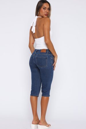 Meet the capri’s everyone’s talking about! The Annie Low Rise Capri Jeans Dark Blue features a low rise fit. front button and zipper closure. 5 pocket design. 3/4 length with side split detailing. unlined. denim material with a slight stretch and side back logo detailing. Team with a basic tank. slides and sunnies for the perfect weekend fit!