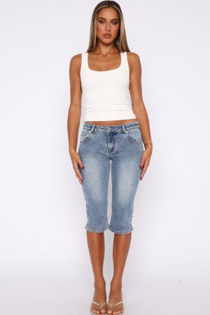 Meet the capri’s everyone’s talking about! The Annie Low Rise Capri Jeans Vintage Light Blue features a low rise fit. front button and zipper closure. 5 pocket design. 3/4 length with side split detailing. unlined. denim material with a slight stretch and side back logo detailing.
