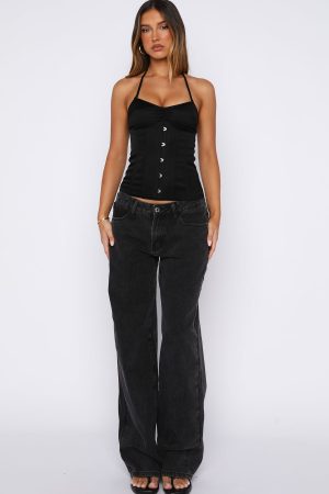 Hot girl hours: activated in the Applying Pressure Bustier Black. Thin self‑tie halter straps frame a curved neckline and ruched bust detailing. Internal boning and under‑bust seam sculpt your shape. while a fixed hook‑and‑eye front closure and back zipper with hook‑and‑eye finish keep things secure and sleek. Fully lined and crafted in a silk‑like fabric. Style with low rise jeans and gold accessories for a look we love!