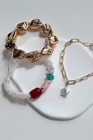 Summer styling made effortless! The Aster Bracelet Set Gold features three bold bracelets. One in polished chain. one with pearl beads. and one in textured gold finish. Stack them over your favorite sun-dress for that instant IT-girl aesthetic.
