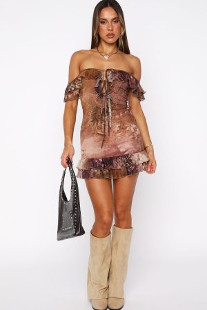 Fusing country influences with effortless glamour in the Aurelia Off Shoulder Mini Dress Antique Bloom! Features an elasticated off-the-shoulder neckline with ruffle detailing. a double tie center front. and sash accents. this dress offers a figure-hugging silhouette with a ruffled hemline. Crafted from high-stretch fabrication. it’s fully lined for comfort and style. Pair with country inspired boots and layered gold jewellery for a festival look we love.