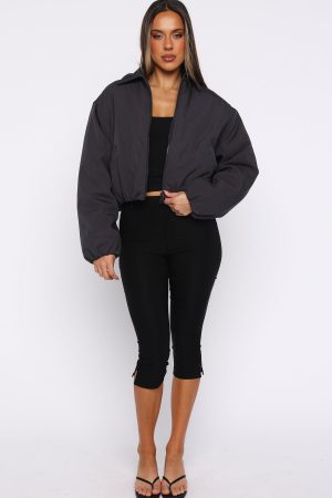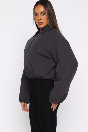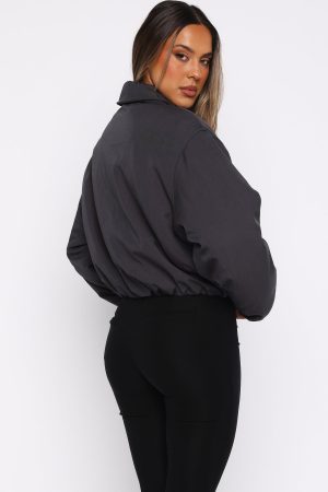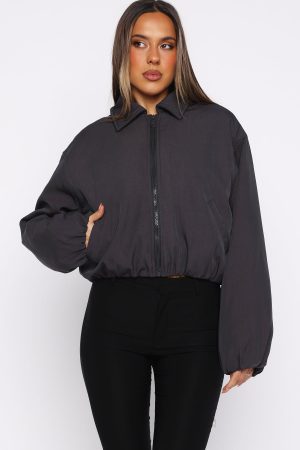BRB. adding to cart! The Back To Friends Jacket in Charcoal features a collar neckline and slouched shoulders. for a relaxed yet chic silhouette. The long sleeves with fixed cuffs and fixed waistline add structure. while the center front zipper closure ensures a sleek finish. Functional side pockets provide practicality. and the jacket is fully lined for added comfort. Style with your go-to denim jeans and sandals for a cool girl fit.