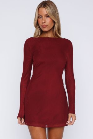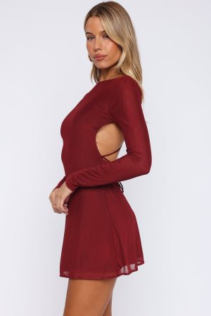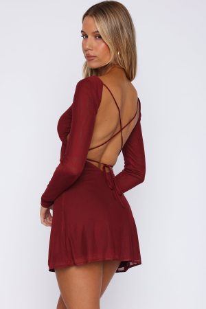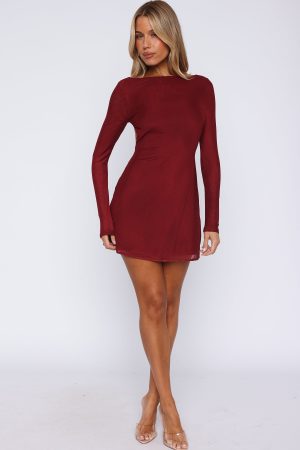Get girls night out ready with the Bad Influence Long Sleeve Mini Dress Burgundy! Features high cut neckline. long sleeves. lined and backless with self tie cross over straps. This fit isn’t complete without heels. gold accessories and a shoulder bag.