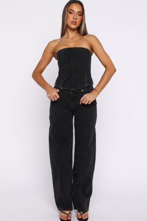 Embrace a double denim moment with the Be Mine Forever Denim Bustier in Black Acid. This strapless piece features grip tape for secure wear. a structured bodice with internal boning. and a corset-inspired lace-up back. and fully lined. Style with the matching denim jeans in Black Acid for our newest obsession!