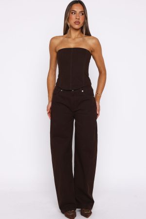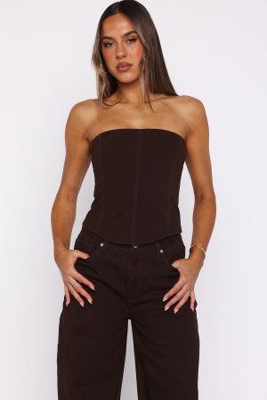 Embrace a double denim moment with the Be Mine Forever Denim Bustier in Chocolate Wash. This strapless piece features grip tape for secure wear. a structured bodice with internal boning. and a corset-inspired lace-up back. and fully lined. Style with denim jeans. sandals and layered gold jewellery for the perfect trans-seasonal fit.