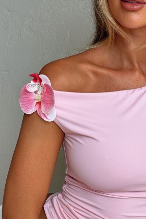 The Be The Vibe Top Baby Pink: perfect for our summer loving angels! Features a one shoulder design with a non detachable flower design. side ruching detailing. cropped length. lined and stretch material for an easy slip on design. Style with booty shorts and layered jewellery to show off your glow!