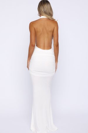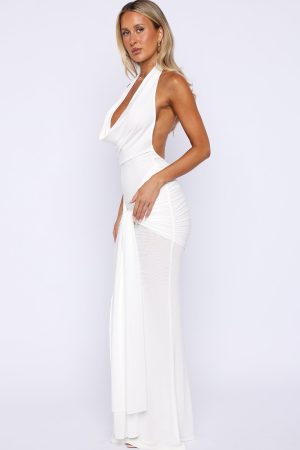 She’s a wife and glowing in the Be With You Forever Maxi Dress in Off White. Features a dreamy fixed halter and cowl neckline. a self-tie sash artfully knotted at the front. and gentle ruching at the hips. Mesh-lined with a low back and high-stretch. figure-skimming fabrication. Pair with simple heels and gold jewellery for a chic. unforgettable wedding rehearsal moment.