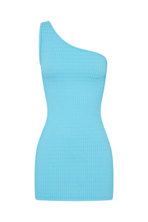 The Beach Bay Mini Dress Malibu Check is hot girl summer approved! Features a one shoulder design. figure-hugging fit. mini length. stretch material for an easy slip on design and unlined. textured material. Style with a cowboy hat and layered gold jewellery!