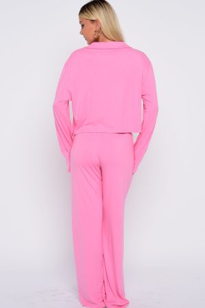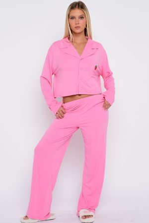 Breeze into bedtime with our Bedtime Bliss Pyjama Set in Bubblegum Pink! The long-sleeve top features a classic collared neckline with button‑front styling. a relaxed silhouette for maximum ease. and a stitched graphic across the front pocket for a cute finishing touch. The matching pants offer a thick. elasticated waistband and wide-leg cut for effortless movement all night long. We are obsessed!