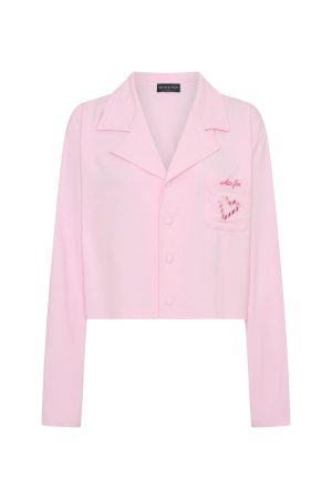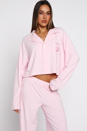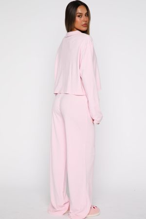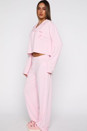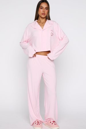 Breeze into the night before Christmas with our Bedtime Bliss Pyjama Set in Soft Pink! The long-sleeve top features a classic collared neckline with button‑front styling. a relaxed silhouette for maximum ease. and a embroiered graphic across the front pocket for a cute finishing touch. The matching pants offer a thick. elasticated waistband and wide-leg cut for effortless movement all night long. We are obsessed!