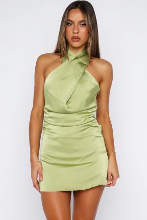 The brief: hot. Our Bet You Regret It Halter Mini Dress in Matcha is designed with a crossover halter neckline. fitted bodice with ruched detailing at the side. mini length. invisible zipper with hook and eye closure and backless. Style it with heels and statement earrings for a night out. or tone it down with sandals and sunnies for daytime cool.