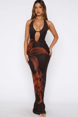 Blossom in the Bets Are Off Maxi Dress in Chai Lily. Features a halter style neckline with button and loop closure. front cut out detailing. backless. mesh lined. sheer. maxi length. and stretch material for an easy slip on design. Let the dress be the main attraction and pair with perspex heels and gold accessories!