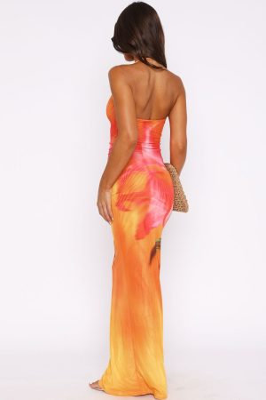 Blossom in the Bets Are Off Maxi Dress Sunset Floral. Features a halter style neckline with button and loop closure. front cut out detailing. backless. mesh lined. sheer. maxi length. and stretch material for an easy slip on design. Let the dress be the main attraction and pair with perspex heels and gold accessories!