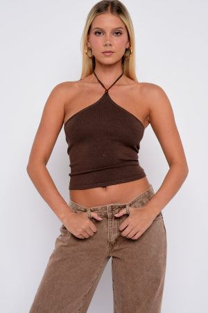 Join the effortlessly cool club. The Better Perspective Knit Halter Top in Bronze dazzles with its thin halter straps and chic apron-style neckline. accented by delicate bead details. Cropped with a subtle shimmer woven into the high-stretch knit. it’s a showstopper. Style with your fav denim jeans. sandals and layered gold jewellery for a look we love.