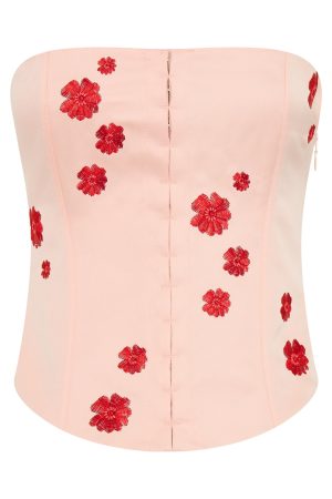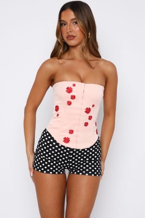 Be a baddie in the Beyond Me Strapless Embroidered Bustier in Pink! Features strapless neckline with grip tape. fixed hook and eye closure down centre front. boning down bodice for a structured fit. lace up back design for a desirable fit and stitched flower detailing. Complete the look with the On The Inside Booty Shorts and sandal for a fun fit!