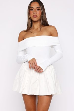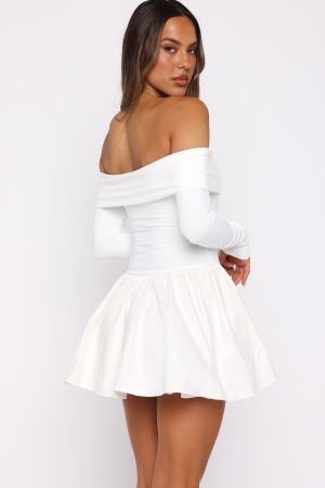 Embrace your feminine energy! The Big Reveal Long Sleeve Mini Dress in Off White exudes timeless elegance with its strapless neckline supported by grip tape. complemented by a fold-over bust detail and long sleeves. The fitted bodice transitions into a fully lined bell skirt. creating a flattering silhouette. Style with kitten heels and layered gold jewellery for your feminine girl era fit!
