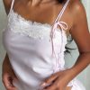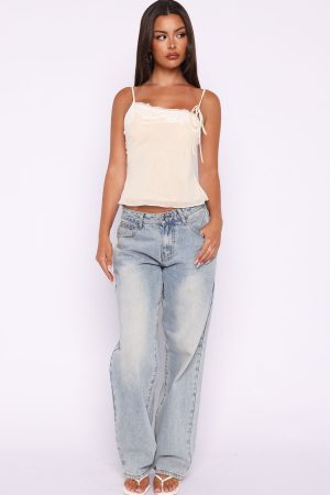Made to be seen. remembered. and talked about. The Blissfully Bold Lace Cami Top Cream features thin. adjustable shoulder straps. an asymmetrical neckline with lace detailing. lined material. lettuce hem design and side self tie detailing at bust. Pair with the low rise jeans and layered gold accessories!