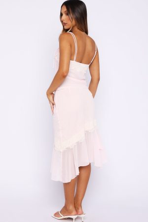 Made to be seen. remembered. and talked about. The Blissfully Bold Midi Skirt Pale Pink features an invisible side zipper and clasp closure. partially lined. asymmetrical hemline. and delicate lace detailing that creates an effortlessly romantic vibe . Pair with the Blissfully Bold Lace Cami Top for a matching moment we adore!