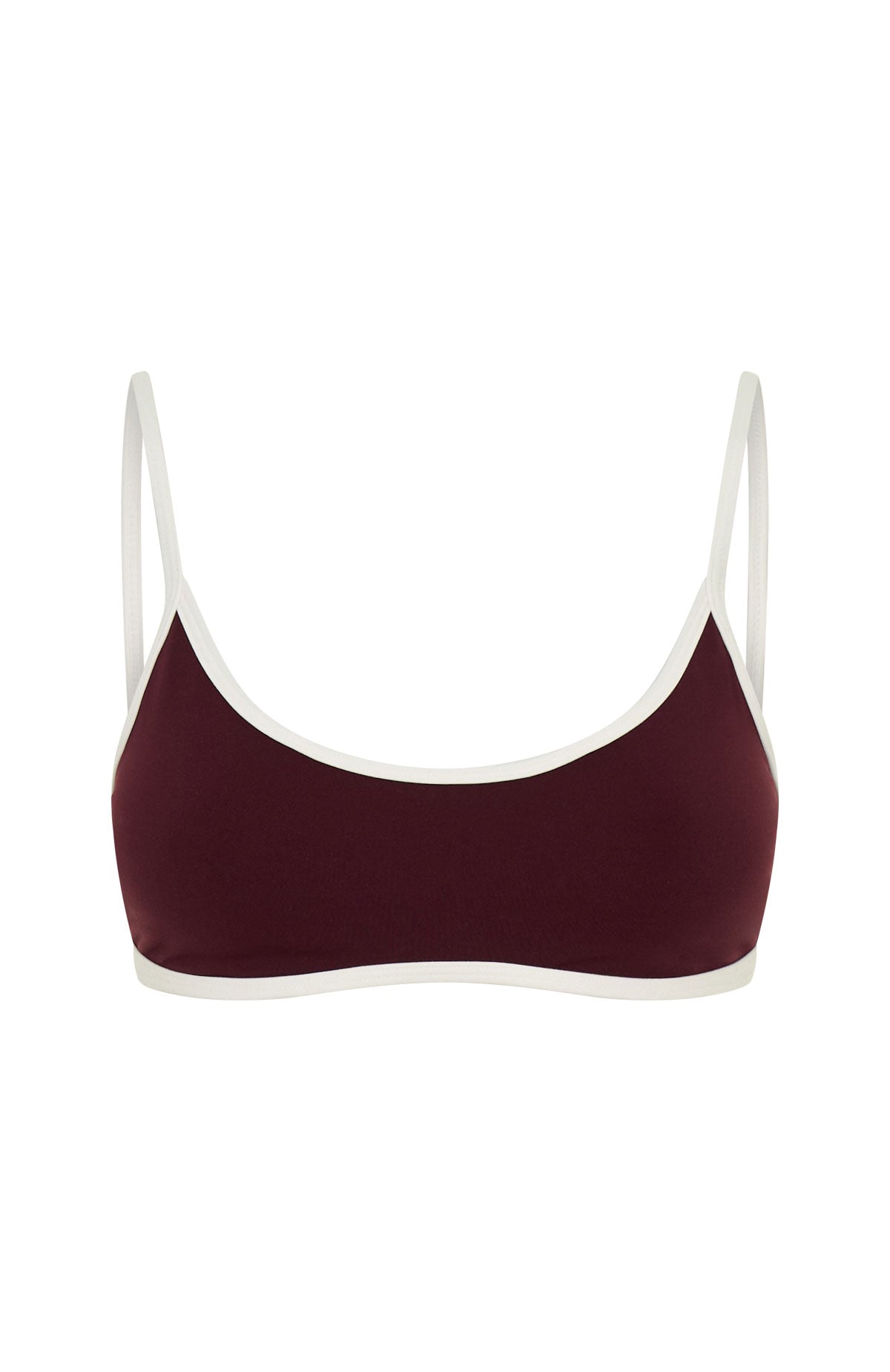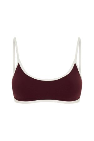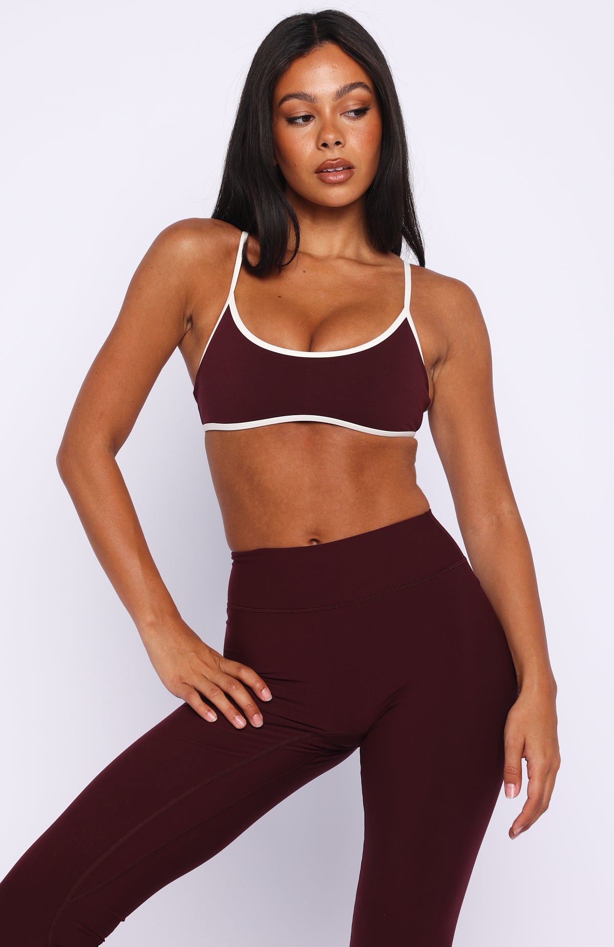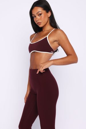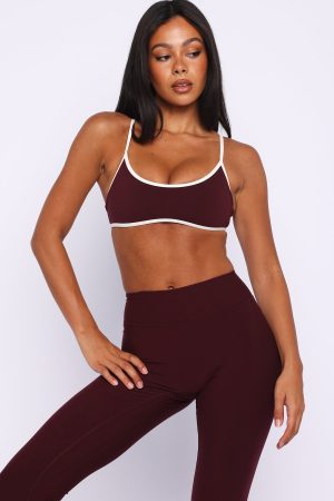 Sipping matcha. slaying Pilates in the Blitz Sports Bra Merlot/Cream. Features thin adjustable shoulder straps. a flattering scoop neckline and open back. removable padding. supportive under‑bust elastic. full lining. and subtle WFA initials printed at the front side. Pair with matching bottoms in Merlot and your fave sneakers.