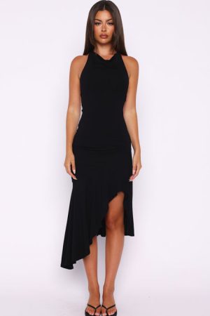 Because love is in the details. and this dress has plenty…Our Blushing Nights Midi Dress in Black features a high. halter neckline with cowl detailing. fully lined material. asymmetrically waterfall hemline. backless detail. soft stretch material for an easy slip on design and midi length. Pair with stiletto heels for an effortlessly flirty look!