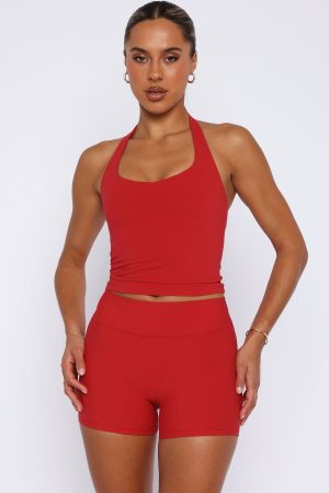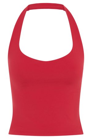 Your next sweat session is calling out for Body Pump Active Tank Cherry Red. Features a halter style neckline with a scoop neckline. thick stretch strap. fitted design. lined. removable padding with inbuilt crop and custom patch detail. Pair with the matching Radiate High Waisted Shorts in Cherry Red.