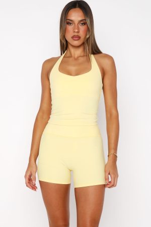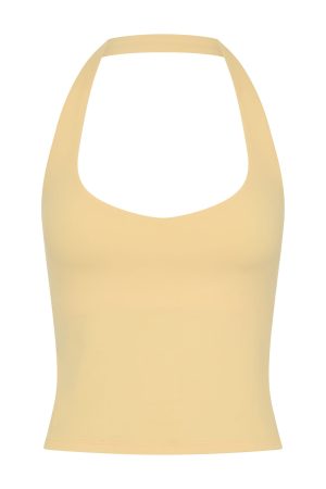 Crush your next workout in style with the Body Pump Active Tank in Honey. This vibrant crop features high stretch fixed halter straps and scoop neckline. The snug. lined construction includes removable padding and an inbuilt crop for seamless support. Finished with WFA initials at the center back. Pair perfectly with matching Honey WFA bottoms for a coordinated look.