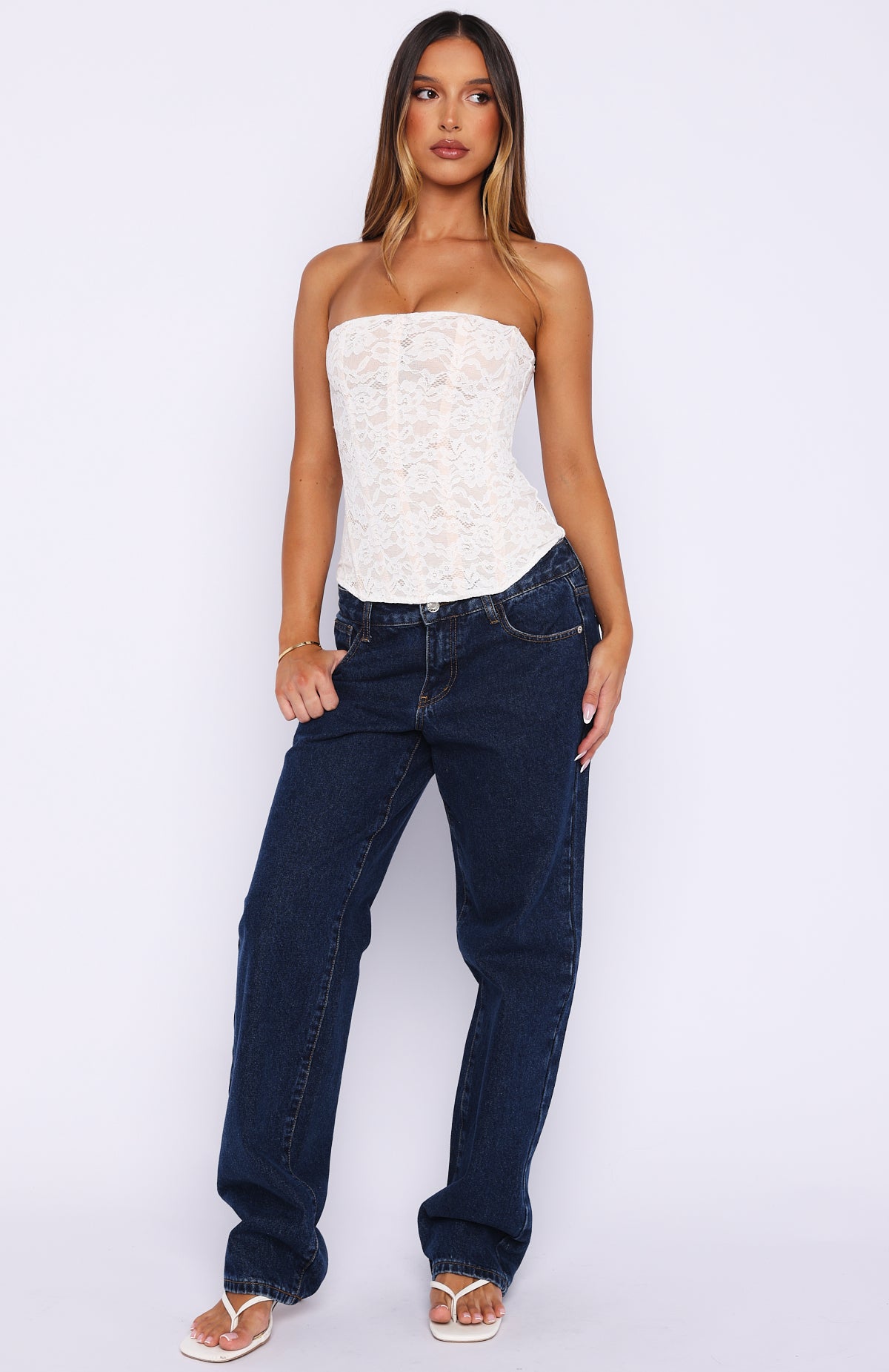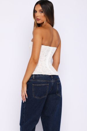 To more date nights. The Booking My Flight Strapless Lace Bustier in White is your go‑to piece. Features a classic strapless neckline and internal boning down the bodice for structure. Made from lace fabrication with a soft mesh lining for comfort. Finished with an invisible back zipper and hook‑and‑eye closure. all in a fitted silhouette that flatters your shape. Style with jeans and layered gold accessories for a look we adore!