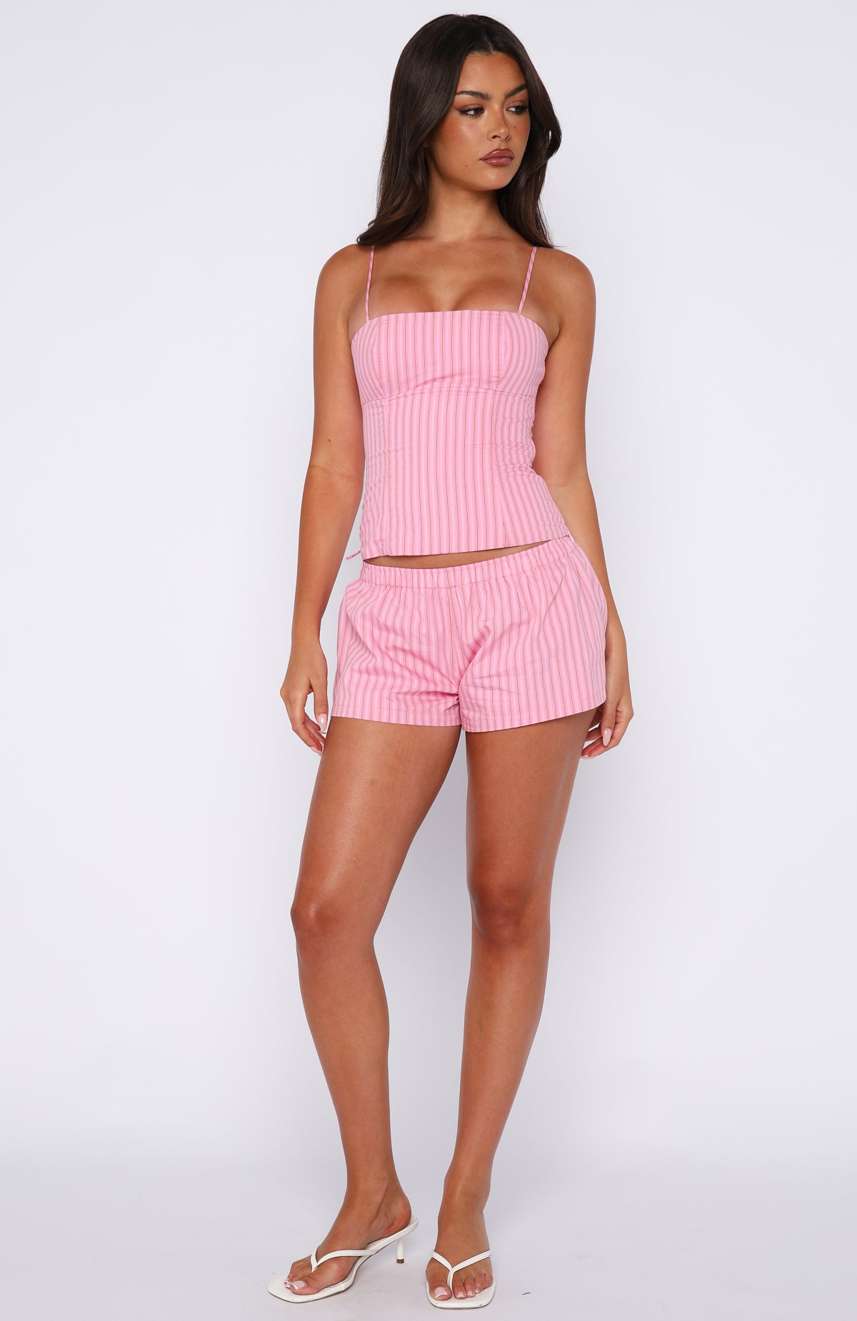 Warning: sizzling! The Born To Glow Shorts in Pink Stripe bring laid-back chic with a thick elastic waistband. relaxed fit. and breezy. fully lined fabrication. The pinstripe design adds subtle sophistication. Pair them with the matching Born To Glow Bustier Pink Stripe and kitten heels for your next long-lunch look.