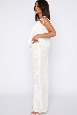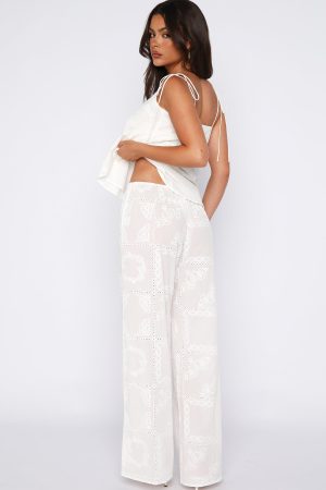 Heat-wave season calls for the Born To Roam Pants in White. Features a slim elastic waistband with external drawstring. a relaxed wide-leg silhouette. unlined comfort. and breezy broderie fabric. Pair with the matching the Wander Wild Top for effortless summer style.