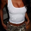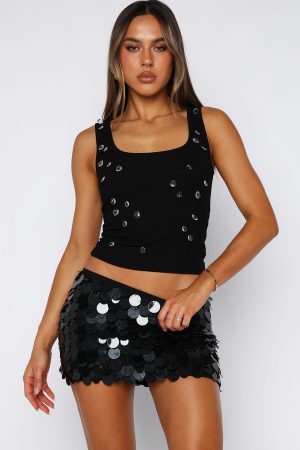 Add some sparkle to your basic tank top with the Brat Girl Summer Tank in Black. Features thick shoulder straps. a flattering square neckline. and an unlined stretch fabric that slips on effortlessly. designed with gem embellishments across the front which elevates your everyday basic tank. Pairs perfectly with a mini skirt and kitten heels for a look that turns heads and never holds back