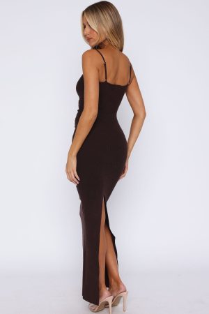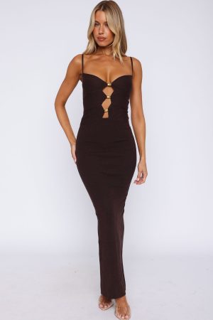 Elevate your spring/autumn wardrobe with the Break It Off Maxi Dress Espresso. Features a plunge neckline. front cu-out design with metallic detailing. thin adjustable straps. soft and high stretch knit fabric. maxi length and unlined. Pair with a thong heel and fresh tan for a fit ready for a long summers night!