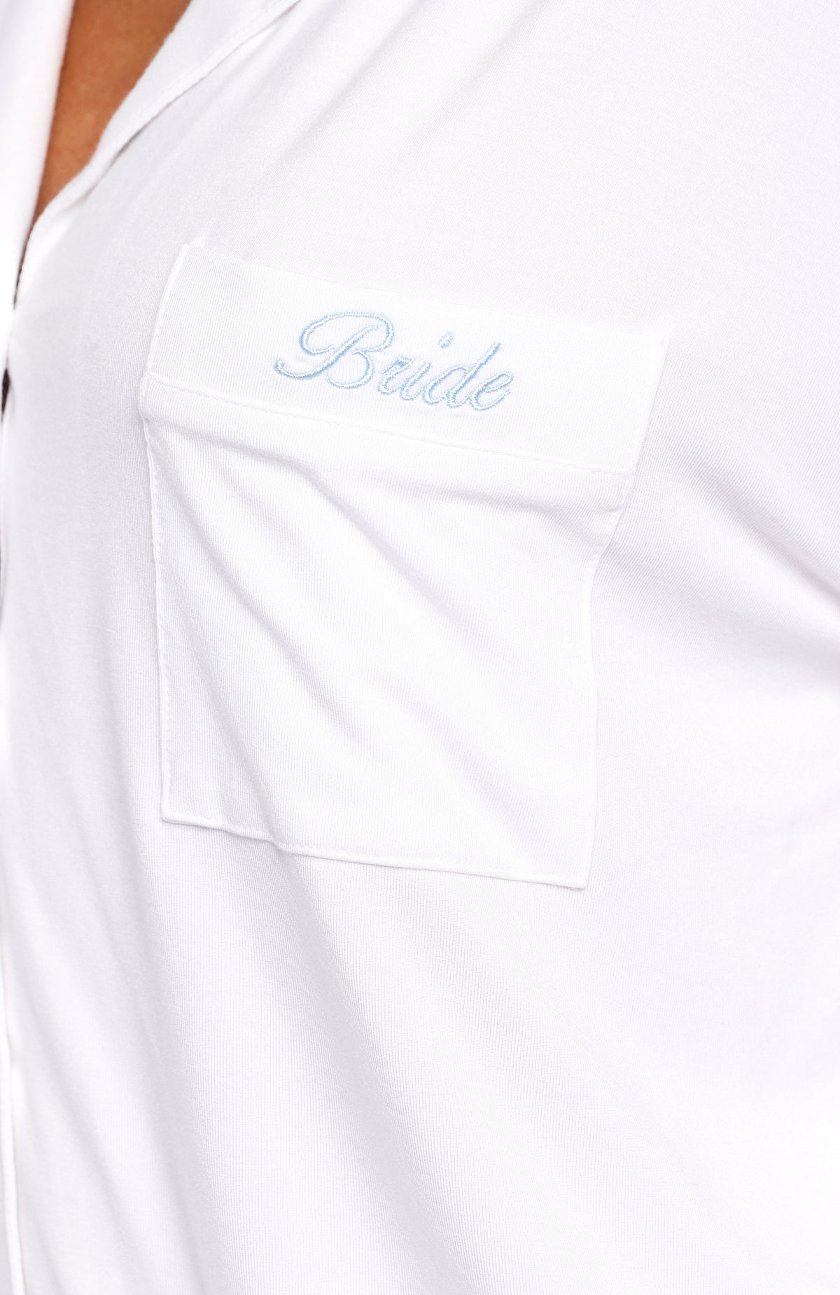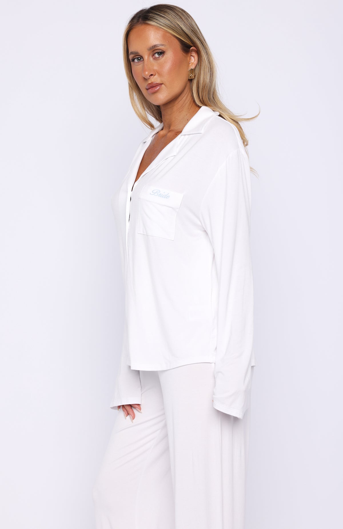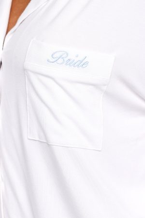 Wrap yourself in bridal charm with the Bridal Party Long Sleeve Pyjama Set Off White. Crafted from ultra soft. high stretch fabric. this set features a cozy collar neck button up top and elasticated-waist pants with a lined interior for next level comfort. Finished with embroidered ‘Bride’ text on pocket. Pair with your go-to slippers and sleep tight before the big day!